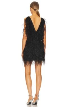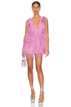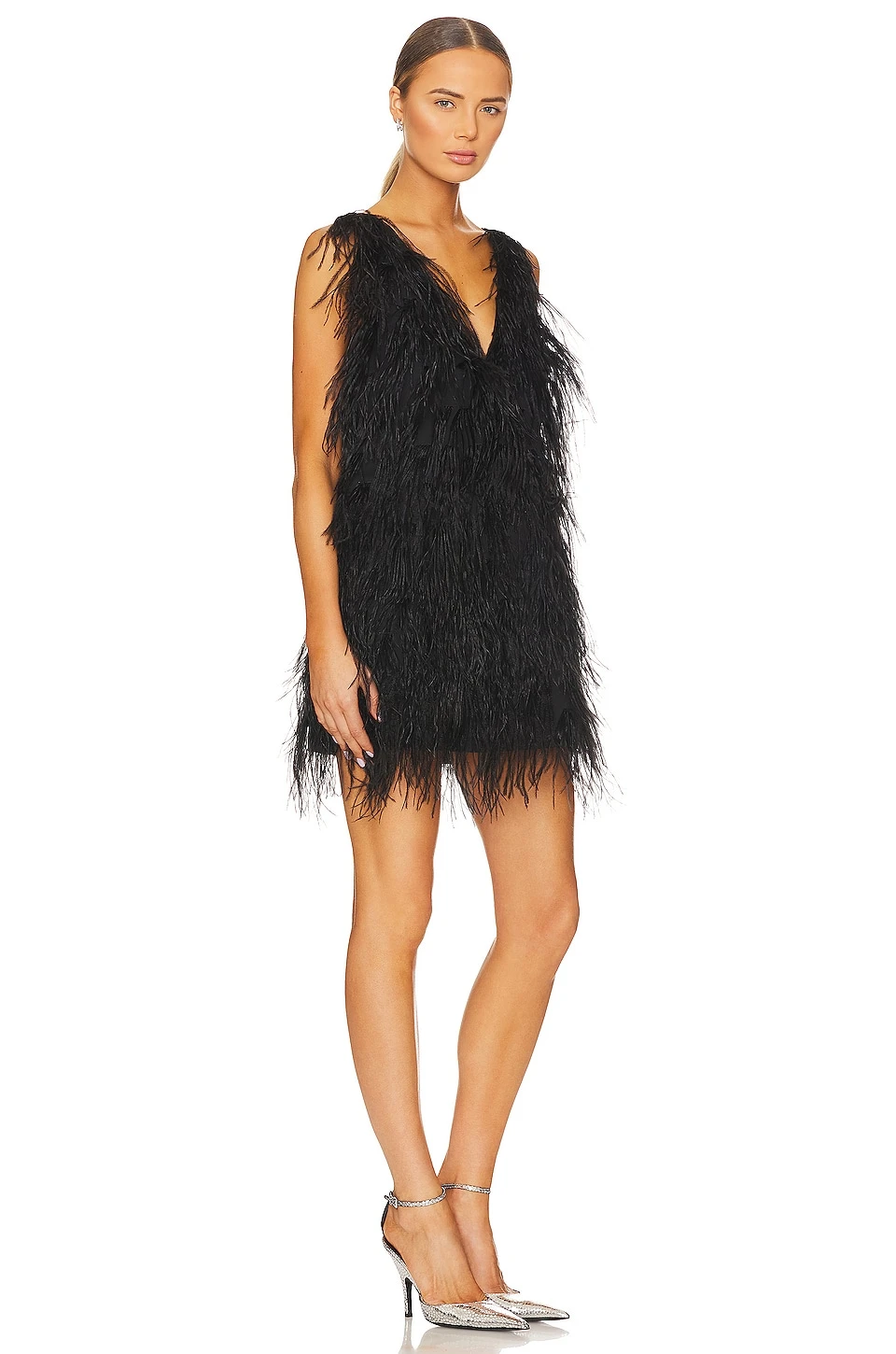 - Feather embellishments throughout
