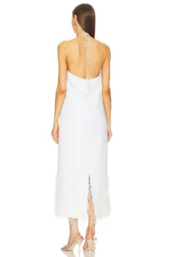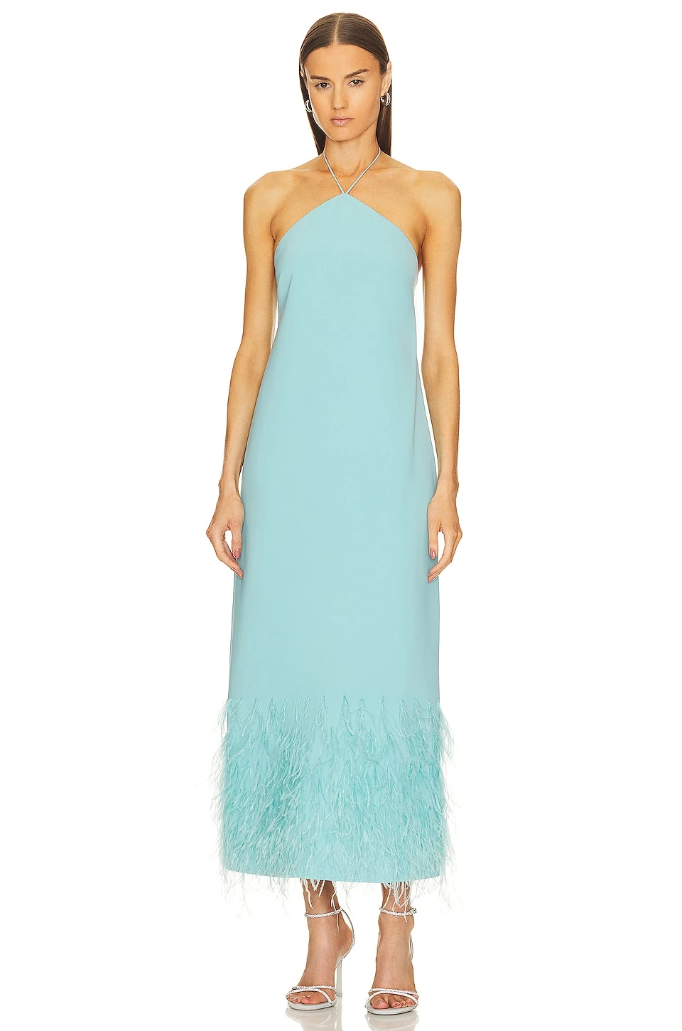 - Hidden back zipper and halterneck tie closure